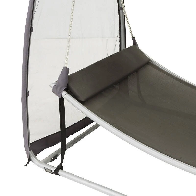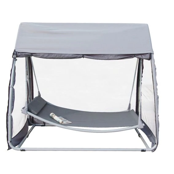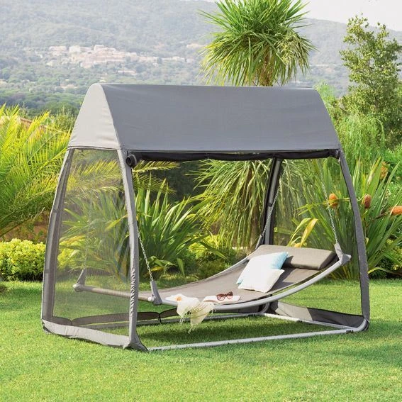 Profitez d’un pur moment de détente ! Design et confortable, cette balancelle est dotée d’une toile moustiquaire, d’un repose-tête, d’un hamac et d’un toit. Une fermeture à glissière vous permet de fermer complètement votre balancelle et ainsi de vous protéger des insectes ! A vous les nuits à la belle étoile !