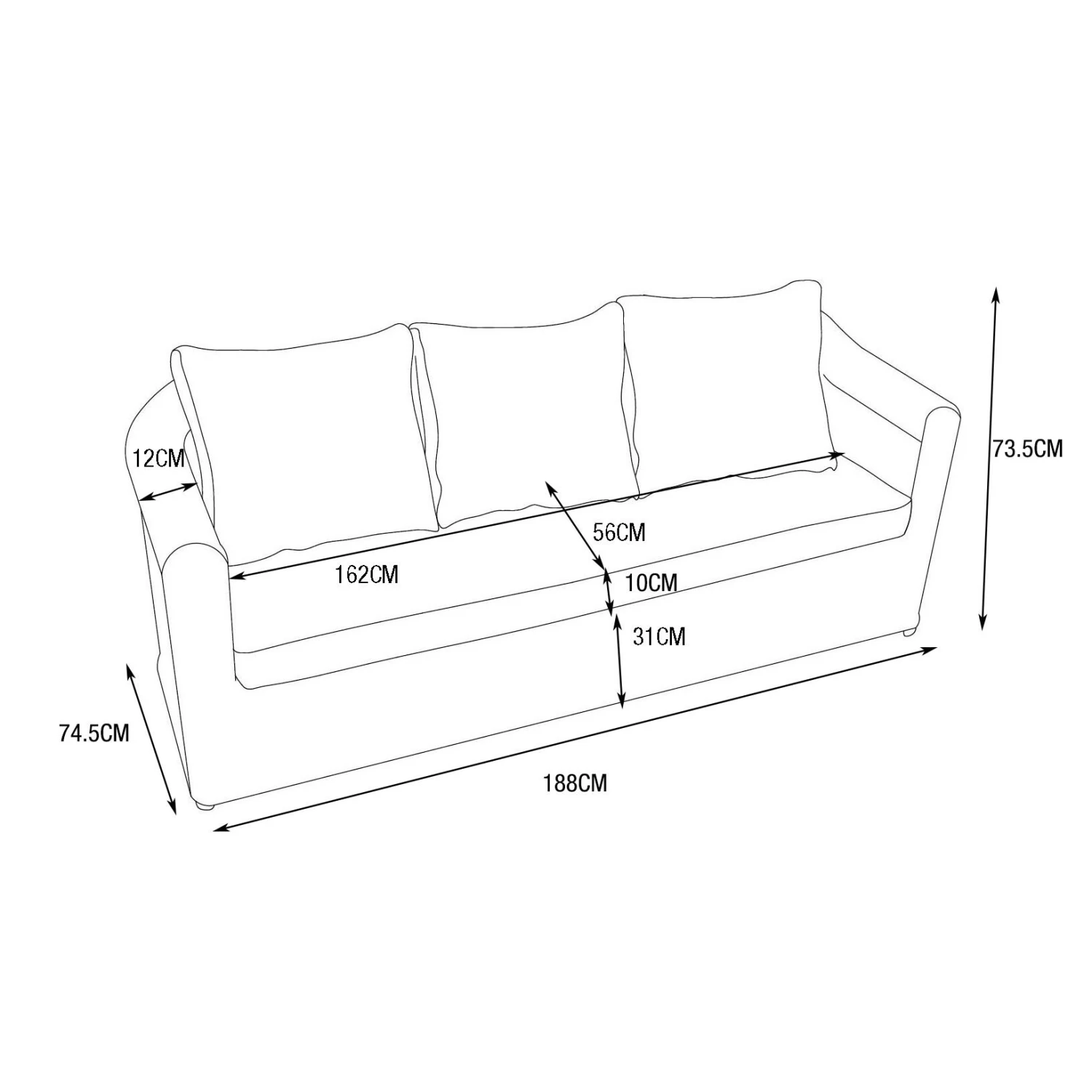 – Coussin d’assise : longueur 162 x largeur 57 x épaisseur 10 cm