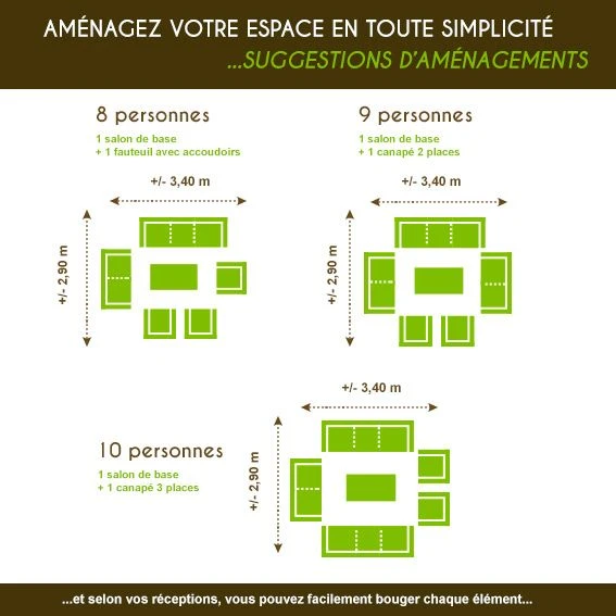 – Coussins : déperlants et déhoussables en polyester (220 gr/m²). Densité 21 kg/m3.