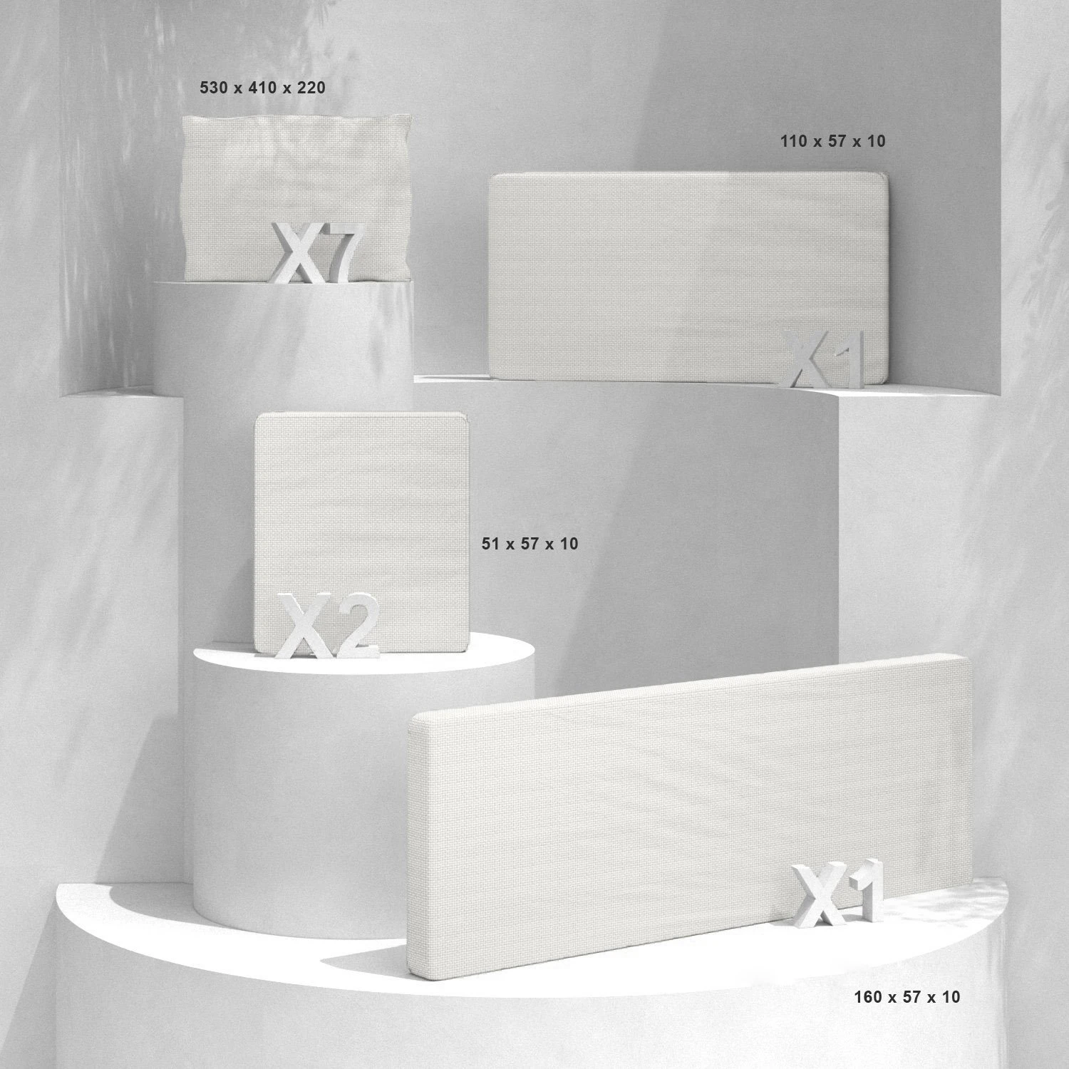 Il comprend : 2 coussins d’assise de fauteuil, 1 coussin d’assise pour le canapé 2 places, 1 coussin d’assise pour le canapé 3 places et 7 coussins de dossier.