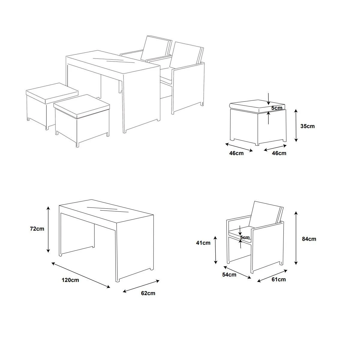 – Table : longueur 120 cm x largeur 62 cm x hauteur 72 cm.