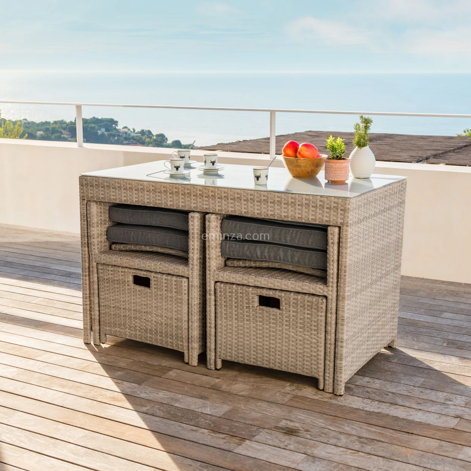 Conçu pour les petits espaces, ce salon de jardin s’adaptera parfaitement aux contraintes des dimensions de votre balcon ou terrasse. Actuel et très déco, il est parfait pour prendre son petit-déjeuner au grand air ou se relaxer en fin de journée !