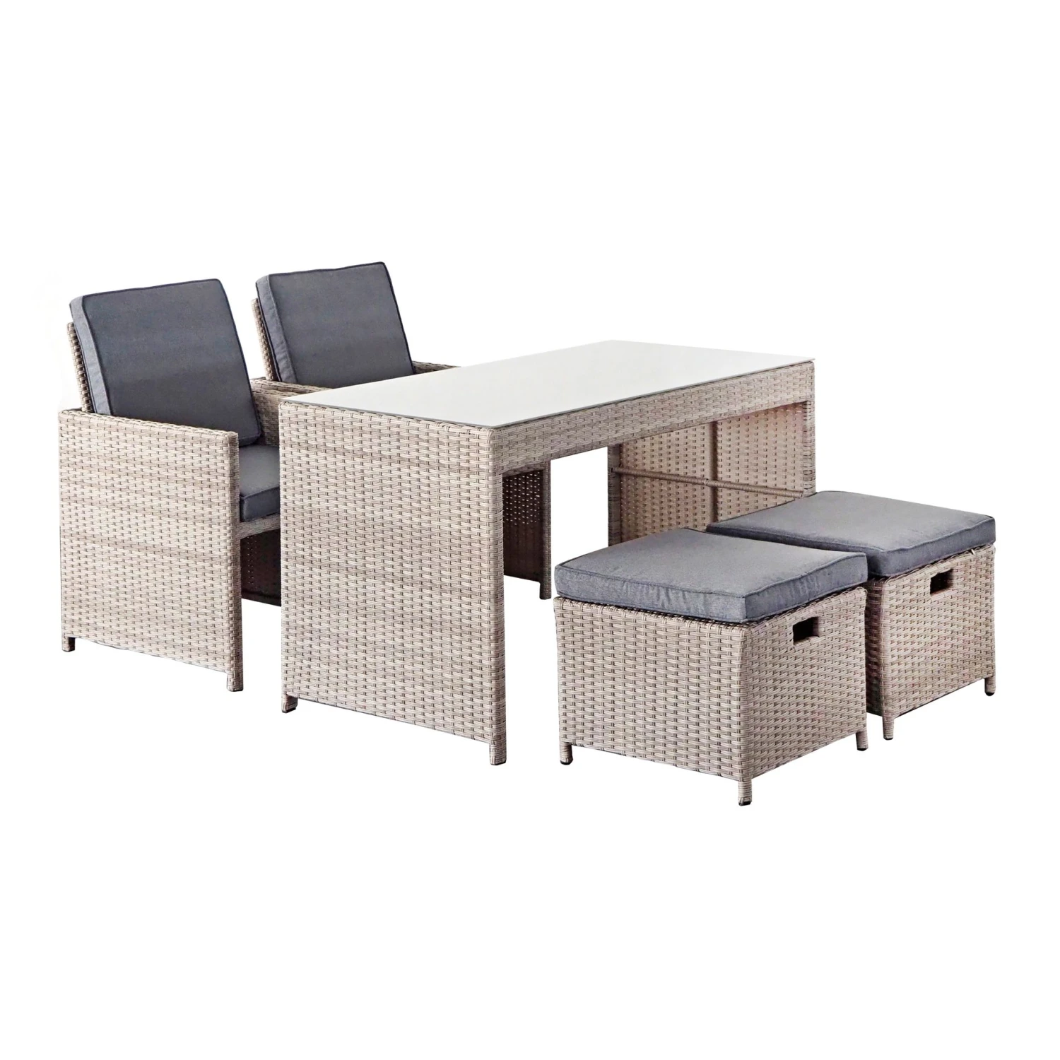 Il comprend : deux fauteuils, deux poufs et une table haute