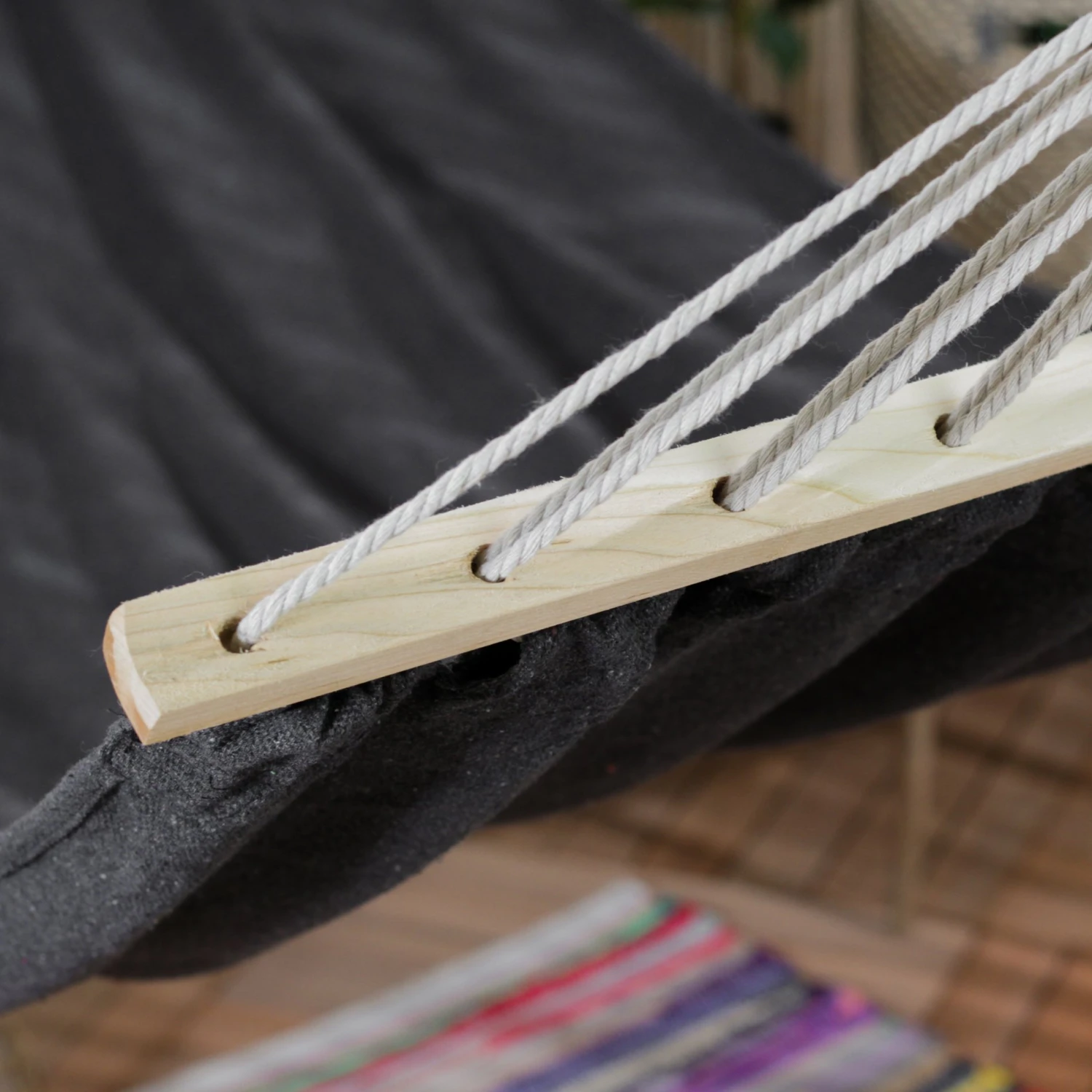 Matière : toile coton et polyester, finition en cordes et bois.