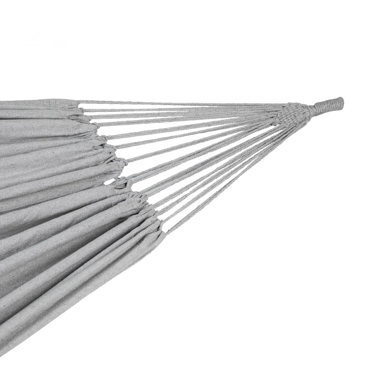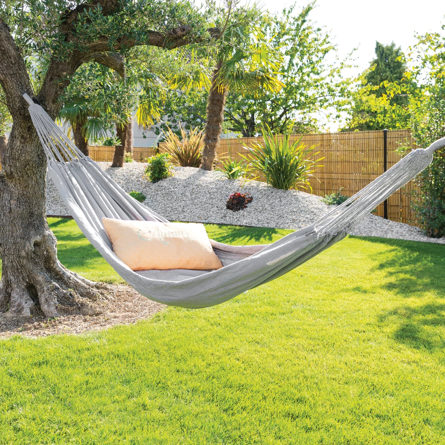 Installez-vous confortablement dans le hamac Yaqui en coton et polyester et profitez d’un moment de calme dans votre jardin.