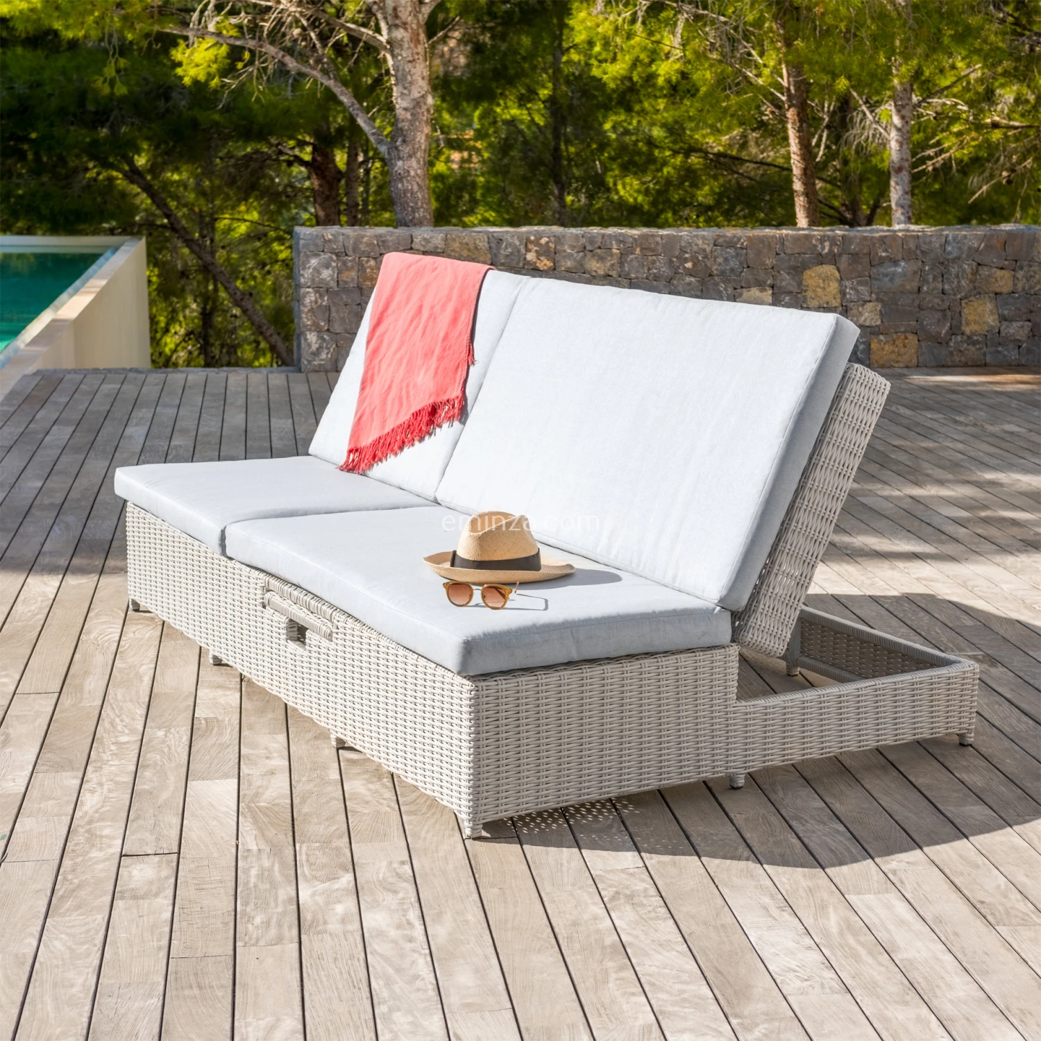 Vous êtes en quête d’un salon de jardin pour vous détendre mais aussi recevoir ? A la fois transat et canapé, ce bain de soleil double sera idéal en toutes situations. Choisissez de régler légérement l’inclinaison des deux dossiers lorsque vous recevez ou totalement à plat pour vos moments de farniente. Les repose-verres situés de chaque côté vous permettent de poser vos boissons ou livres.